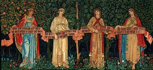 在牛津,莫里斯結(jié)識了終生的摯友、合作伙伴愛德華·伯恩·瓊斯,彼時瓊斯也在研讀神學(xué),日后成為英國著名的畫家和玻璃設(shè)計師。他們都對中世紀(jì)騎士精神和自我犧牲的浪漫故事情有獨(dú)鐘,還在閱讀中接觸到了精神導(dǎo)師約翰·拉斯金(John Ruskin)的理論,他非常認(rèn)同拉斯金反對心思裝飾藝術(shù)中采用工業(yè)制作手法的論述,此后他畢生都在進(jìn)行對哥特風(fēng)格及自然主義風(fēng)格設(shè)計的探索與實(shí)踐。